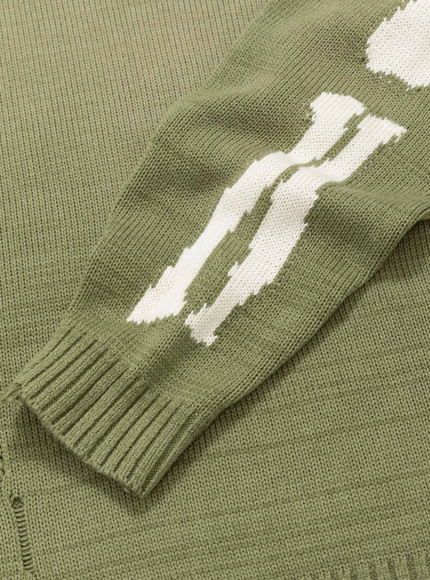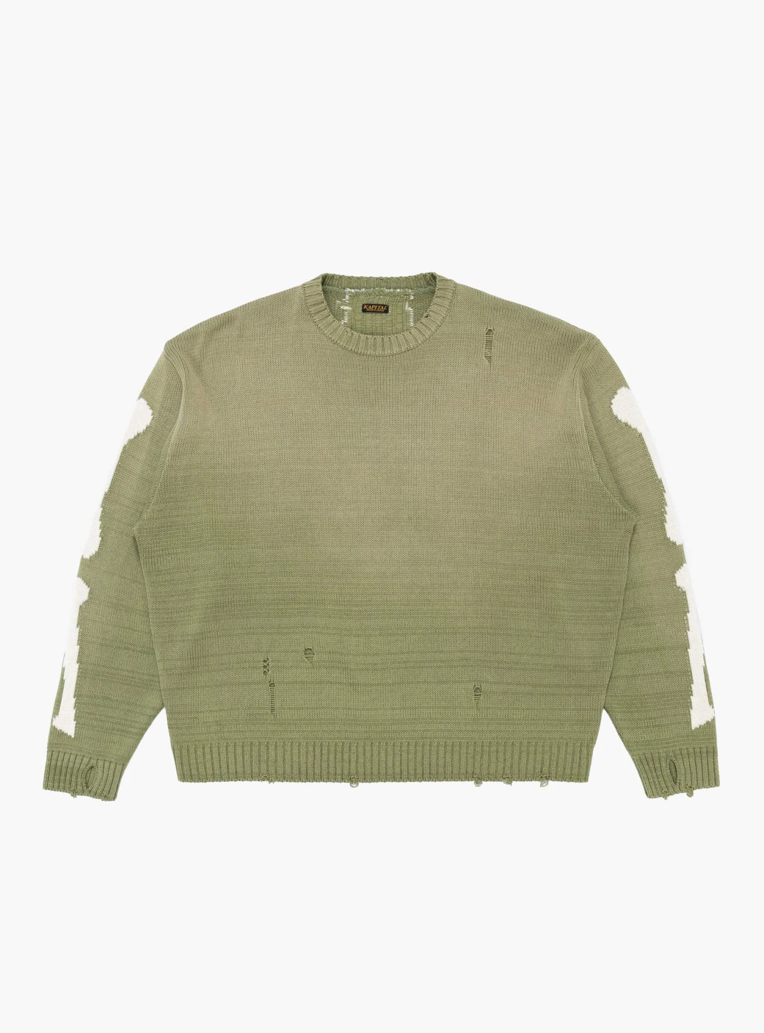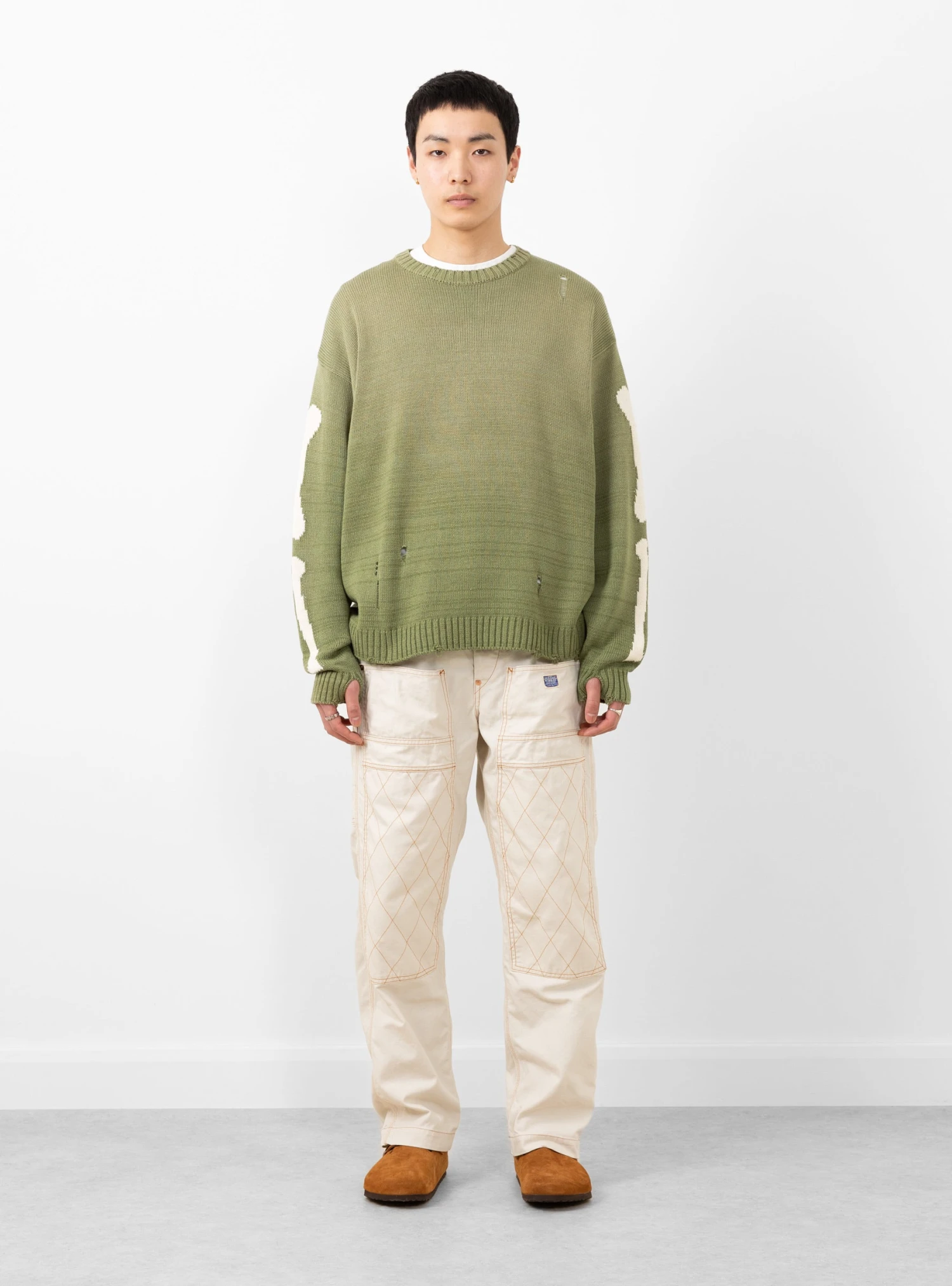 The 5G Cotton Knit Bone sweater from Kapital is cut from a khaki and white cotton-blend. Made in Japan, the mid-weight knit falls to a relaxed fit with dropped shoulders. Distressed detailing give the shirt a vintage look and feel, as does the fade-effect gradient colouring. Kapital’s iconic bone intarsia is knitted across the back of the crewneck.