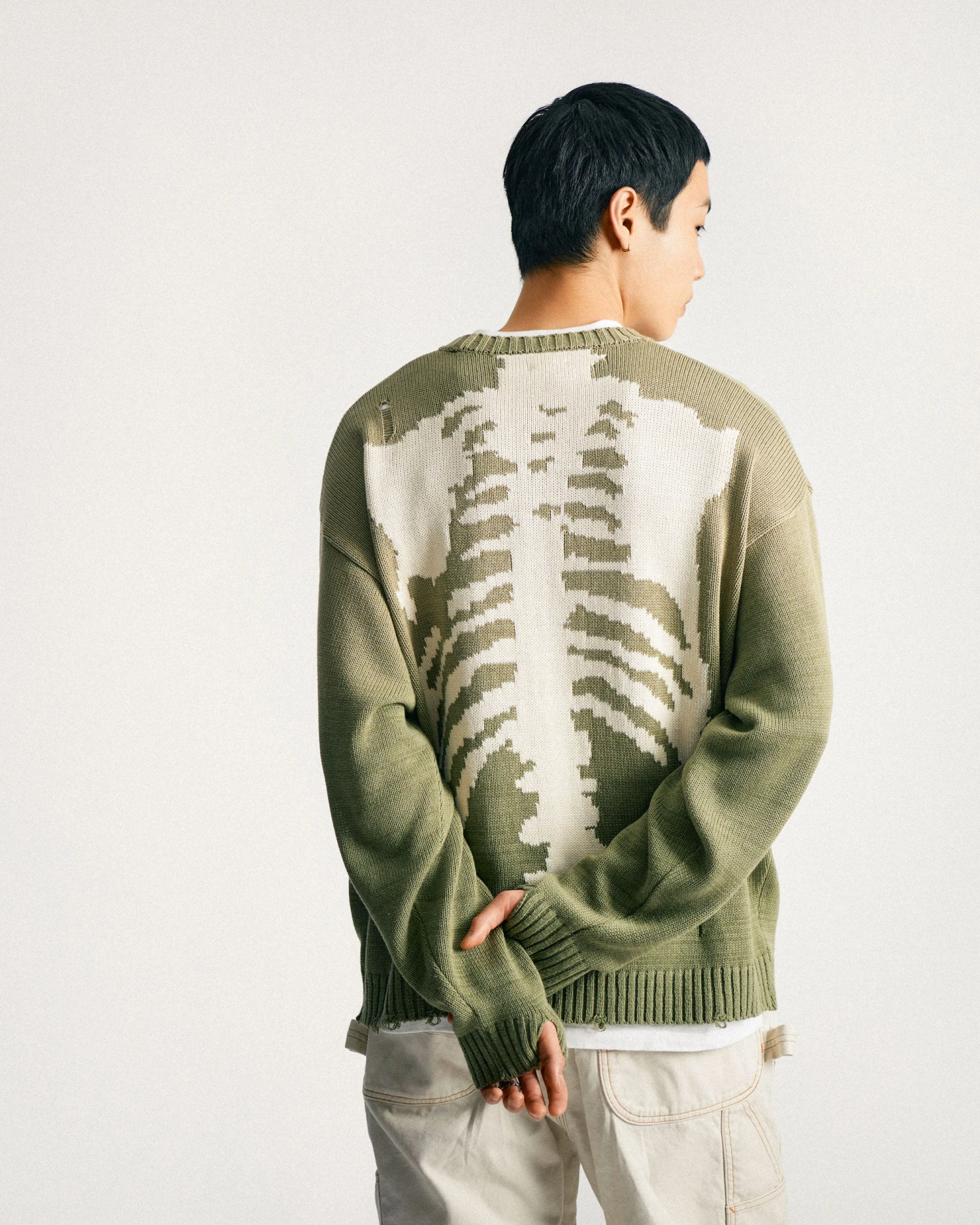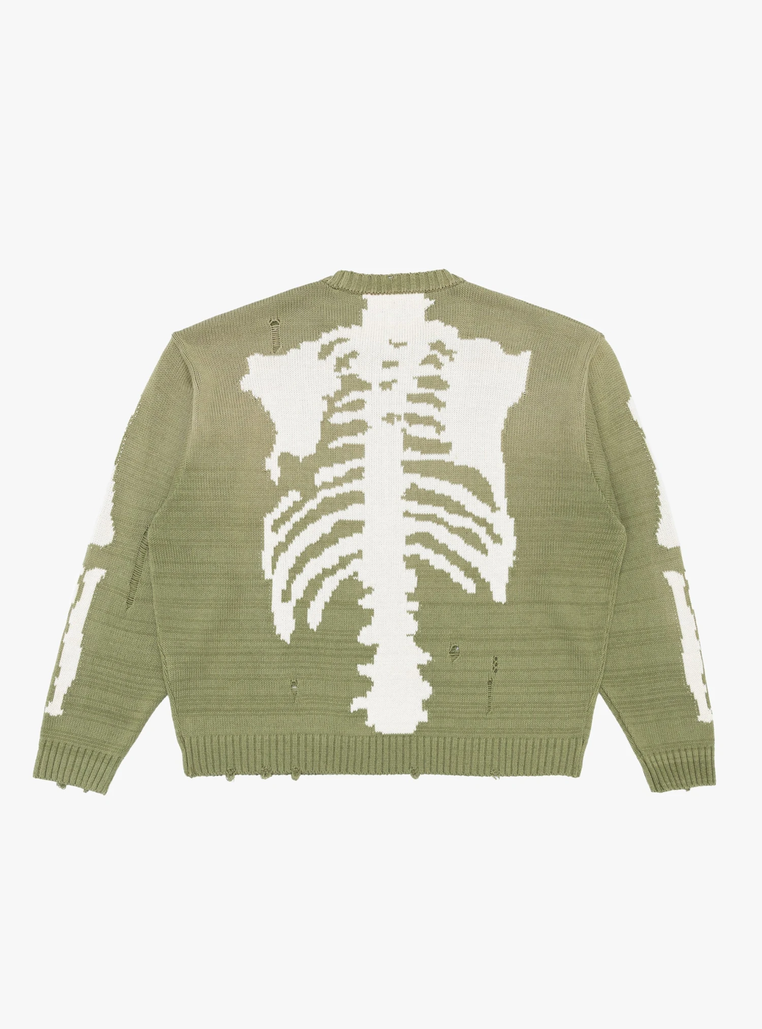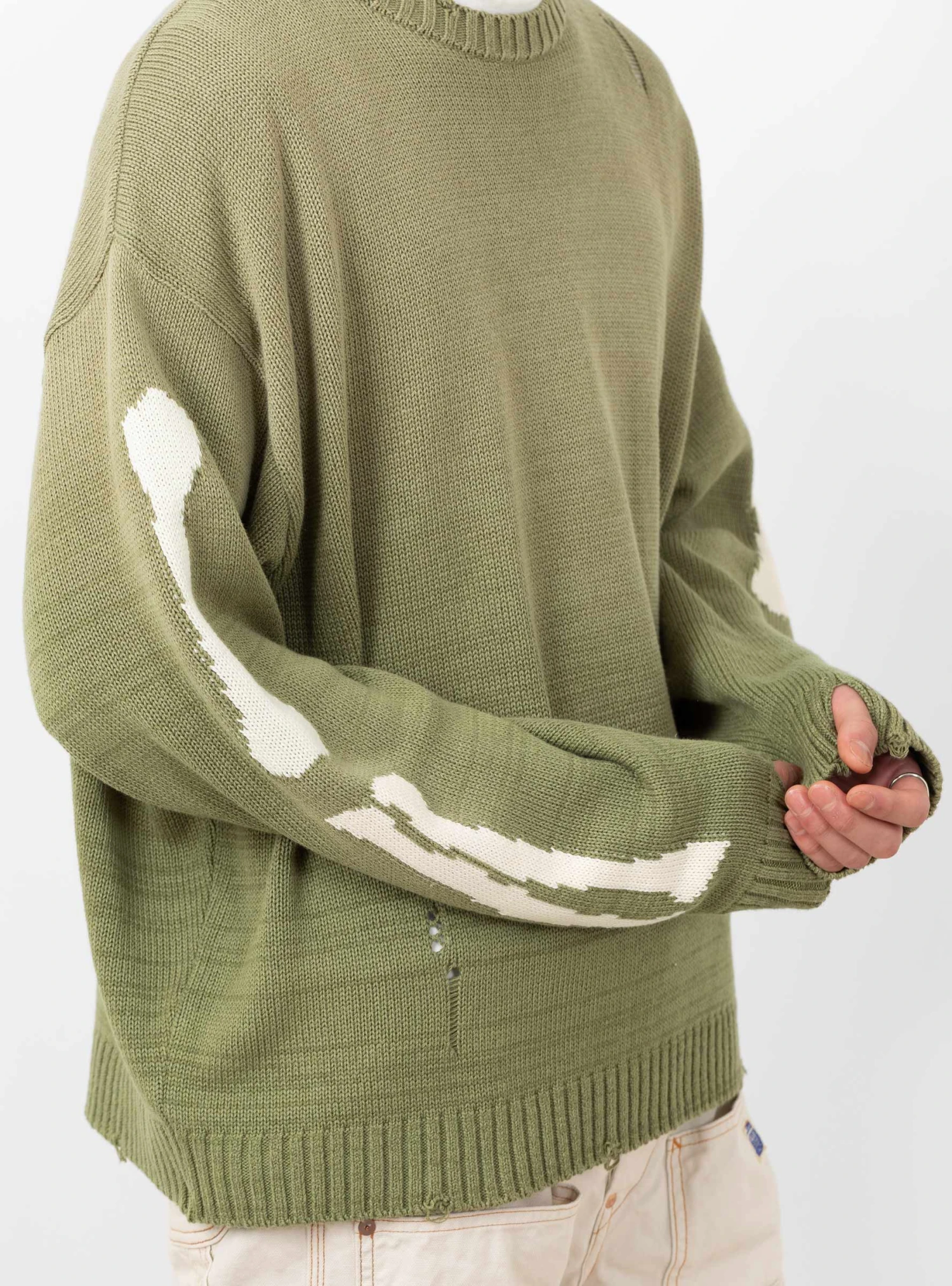 The 5G Cotton Knit Bone sweater from Kapital is cut from a khaki and white cotton-blend. Made in Japan, the mid-weight knit falls to a relaxed fit with dropped shoulders. Distressed detailing give the shirt a vintage look and feel, as does the fade-effect gradient colouring. Kapital’s iconic bone intarsia is knitted across the back of the crewneck.