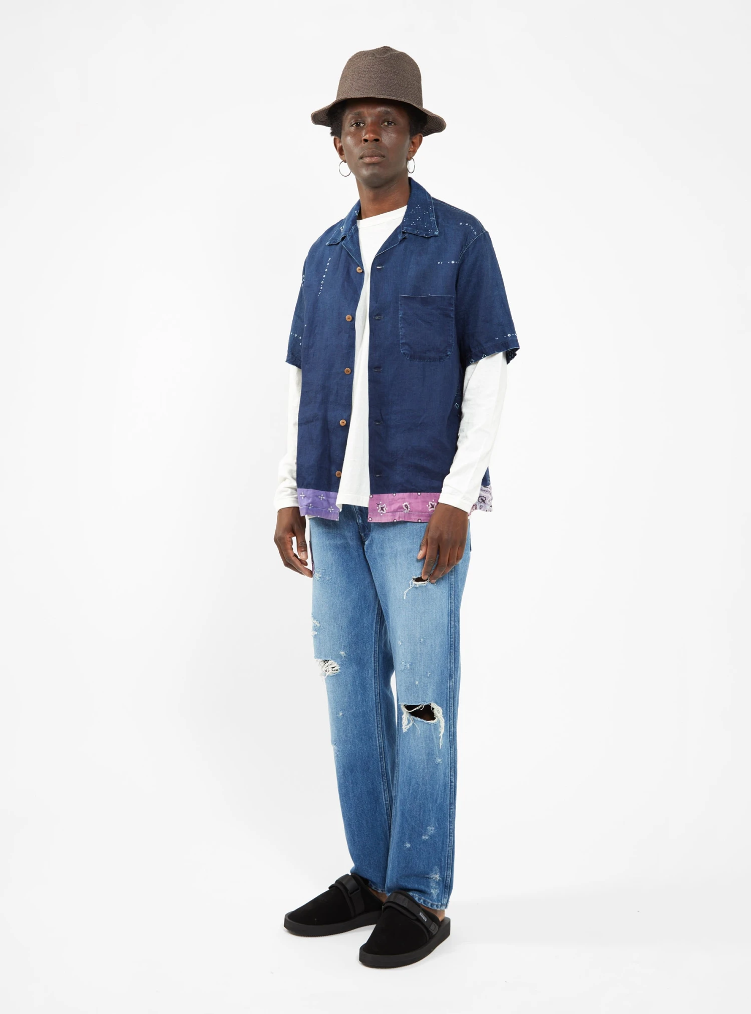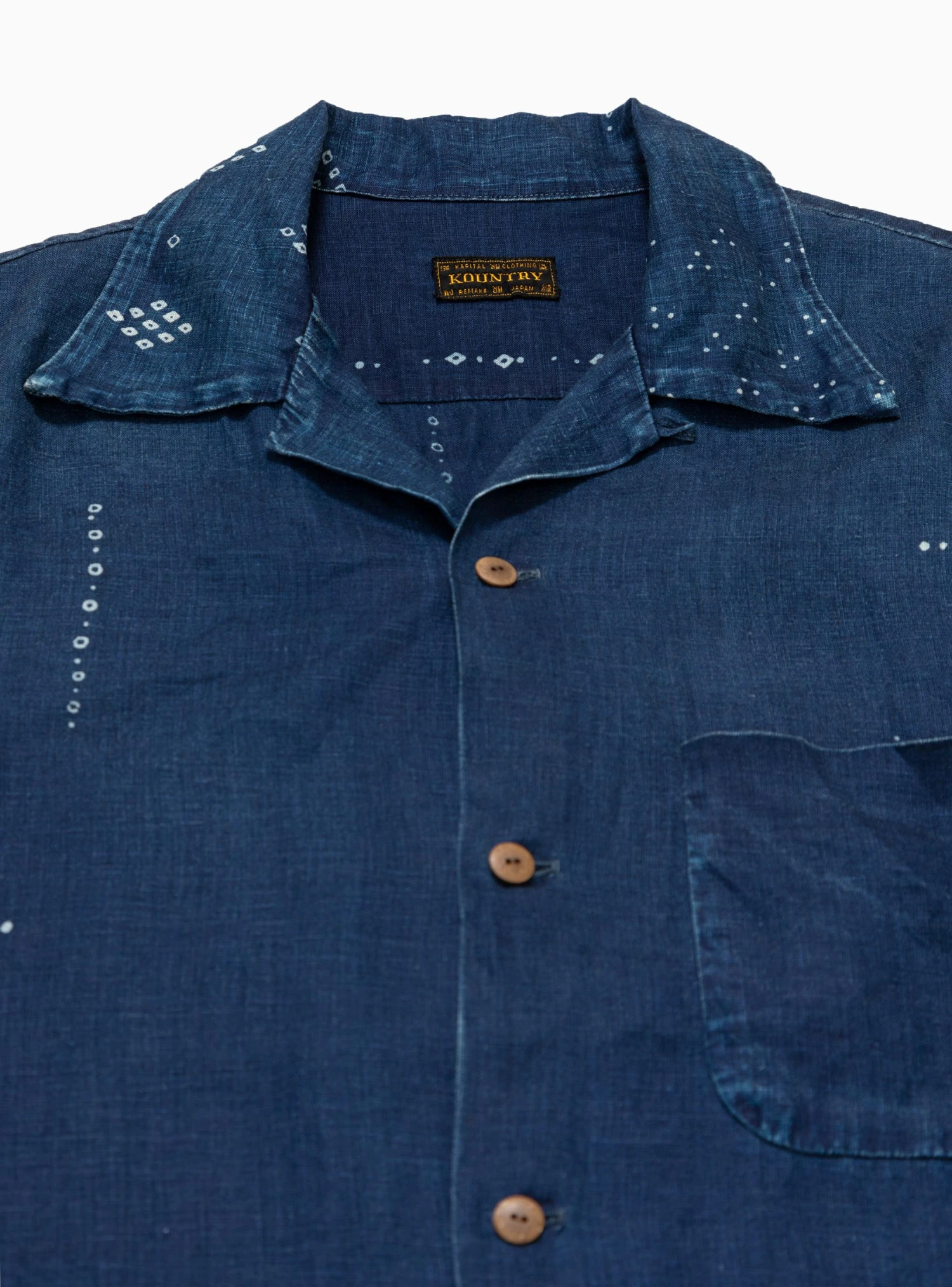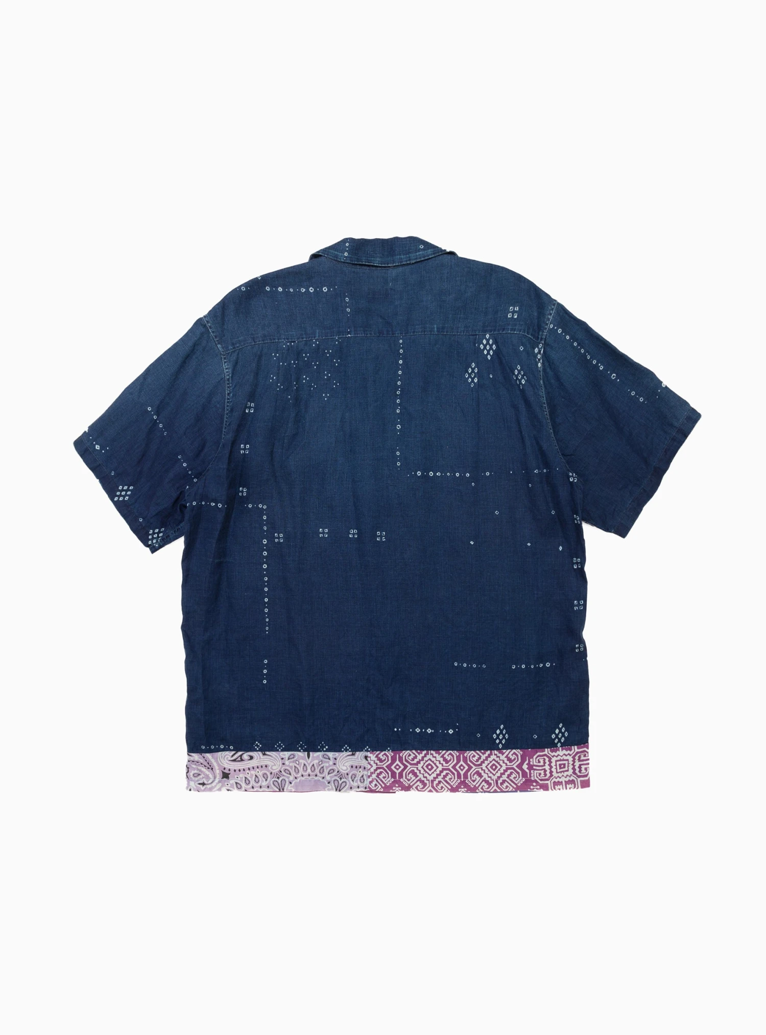 Kapital’s long-standing love affair with bandana print continues, as evidenced by the tasteful hem detailing of the brand’s Bandana Linen Shirt. Cut to a slightly boxy silhouette with a wide collar, this short sleeve button-up features small geometric details scattered throughout, complementing a bandana print in contrasting tones of pink and purple.