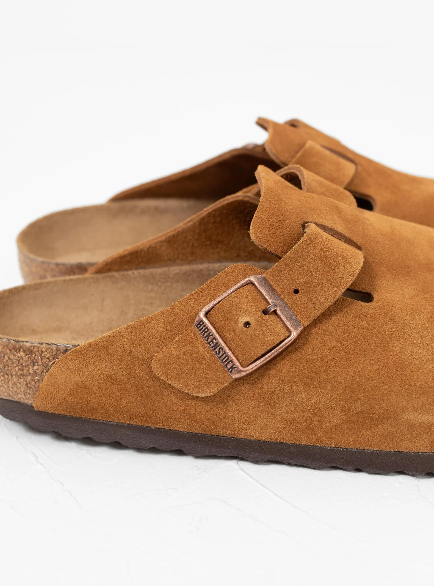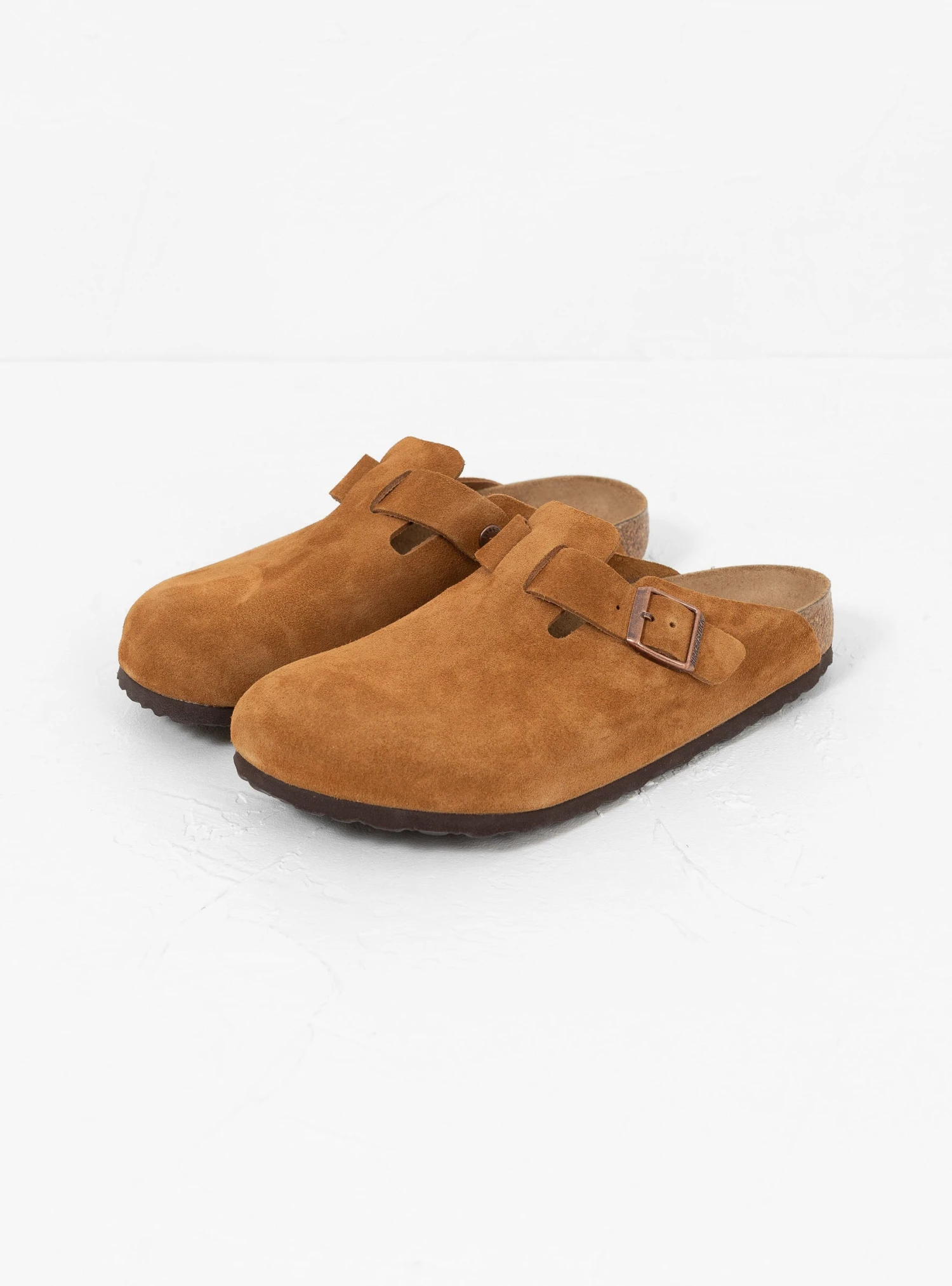 Updated with an additional foam layer, these mink Boston Soft Footbed sandals from Birkenstock are made in Germany from suede, feature anatomical cork-latex footbeds for optimum support and are set on EVA rubber soles.