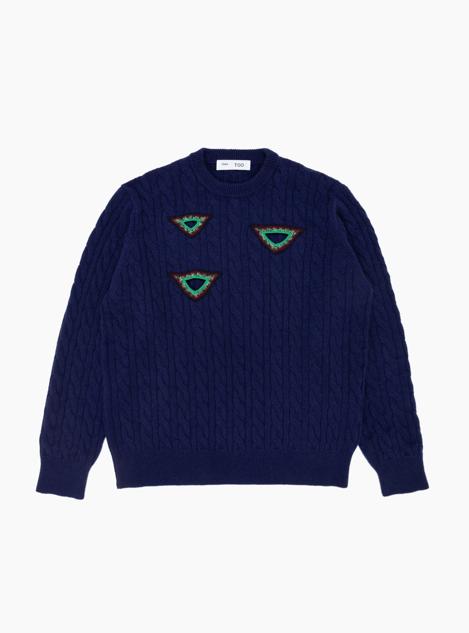 The Cable Knit Pullover from TOGA VIRILIS’ A/W ’24 collection arrives in a navy, with green cutout detailing. Made in Japan from a woollen blend, the pullover falls to a relaxed fit with dropped shoulders. A delicate cable construction gives the jumper a classic look and feel, whilst triangular cutout detailing at the chest is testament to TOGA’s avant-garde design approach.