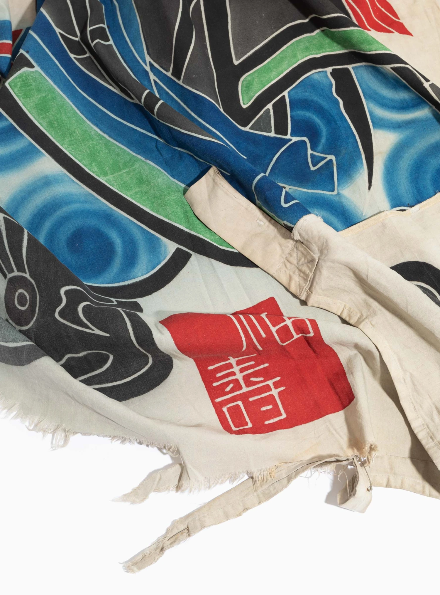 This large vintage Samurai Battle Flag, or Sashimono, features a vibrant hand-painted design on lightweight cotton gauze. Historically used to help soldiers identify each other in battle, the flag features loops on the outer edges which would have been originally attached to a pole.