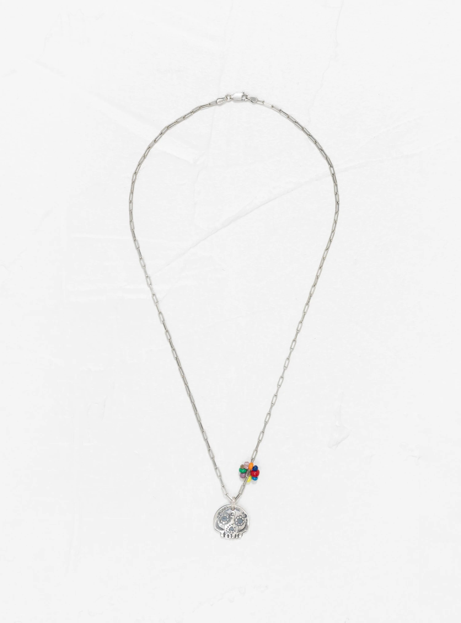 Handmade in Japan, this necklace from NORTH WORKS features a Flower Skull pendant fashioned from a vintage American coin – used for its high silver content – and a 925 sterling silver chain embellished with repurposed Venetian glass beads.