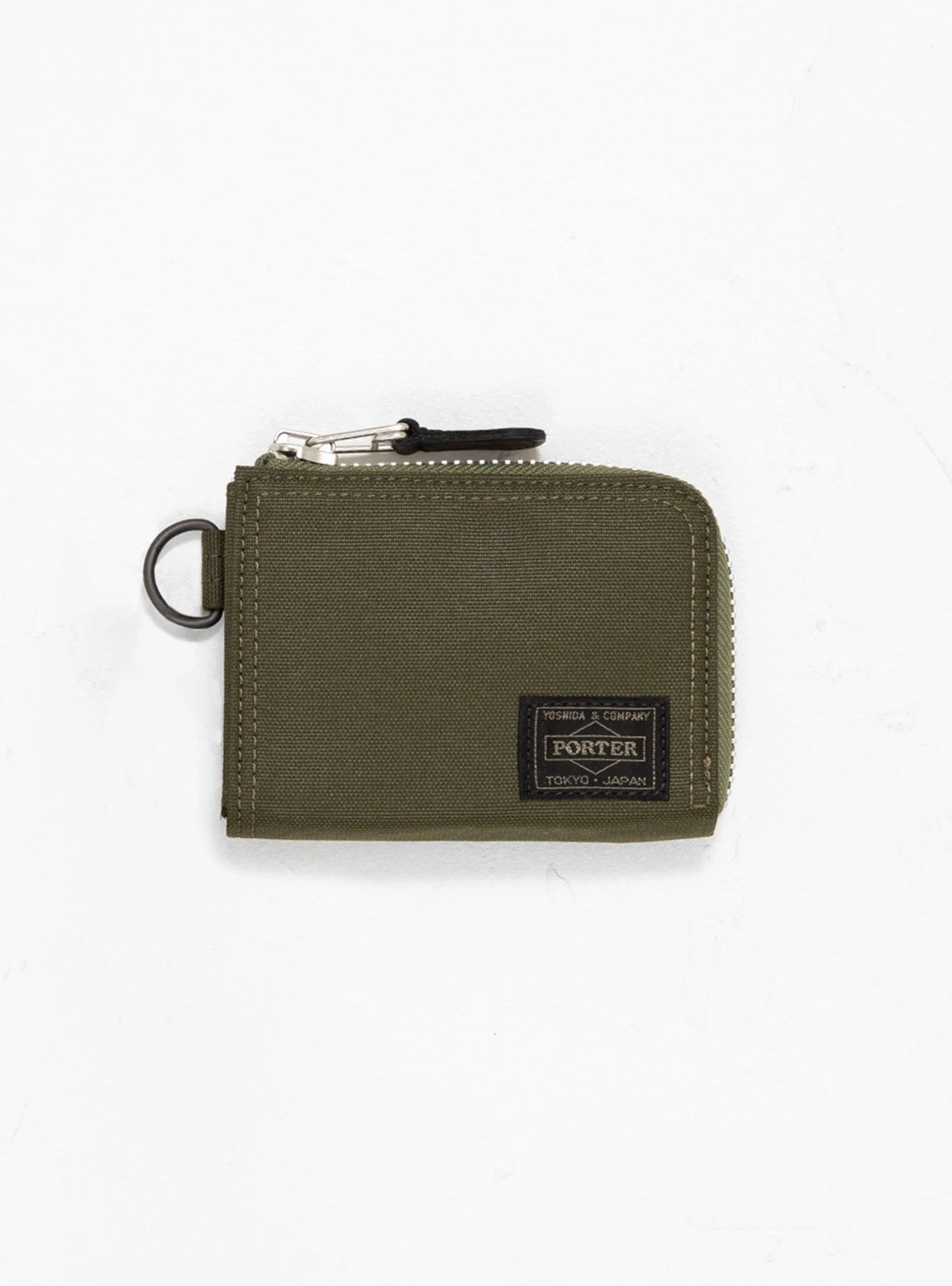 Made in Japan from nylon twill, this olive-drab Flying Ace wallet from Porter Yoshida & Co. has a wrap-around zip fastening which, when opened, reveals an internal zip compartment and two coin slots.