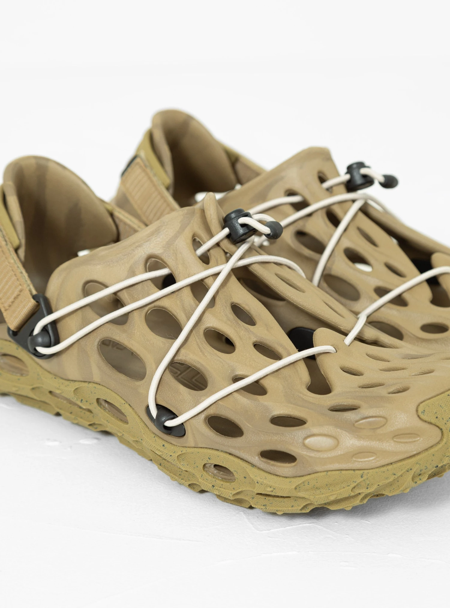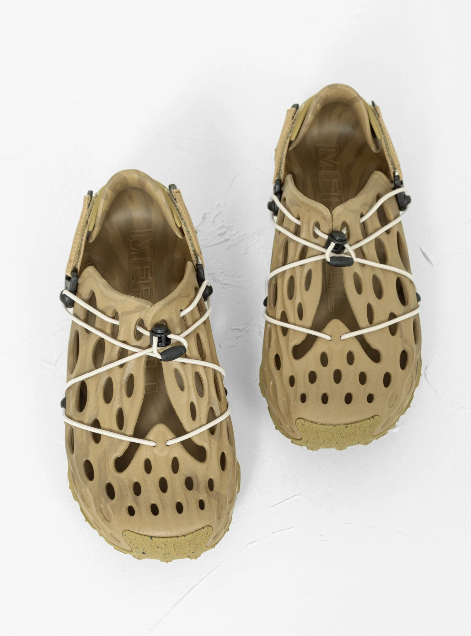 An all-terrain evolution of Merrell’s signature silhouette, the coyote-brown Hydro Moc AT Cage 1 TRL water shoes comprises resilient moulded EVA foam cages atop eco-friendly foam midsoles, featuring rear straps and a toggle lace system.