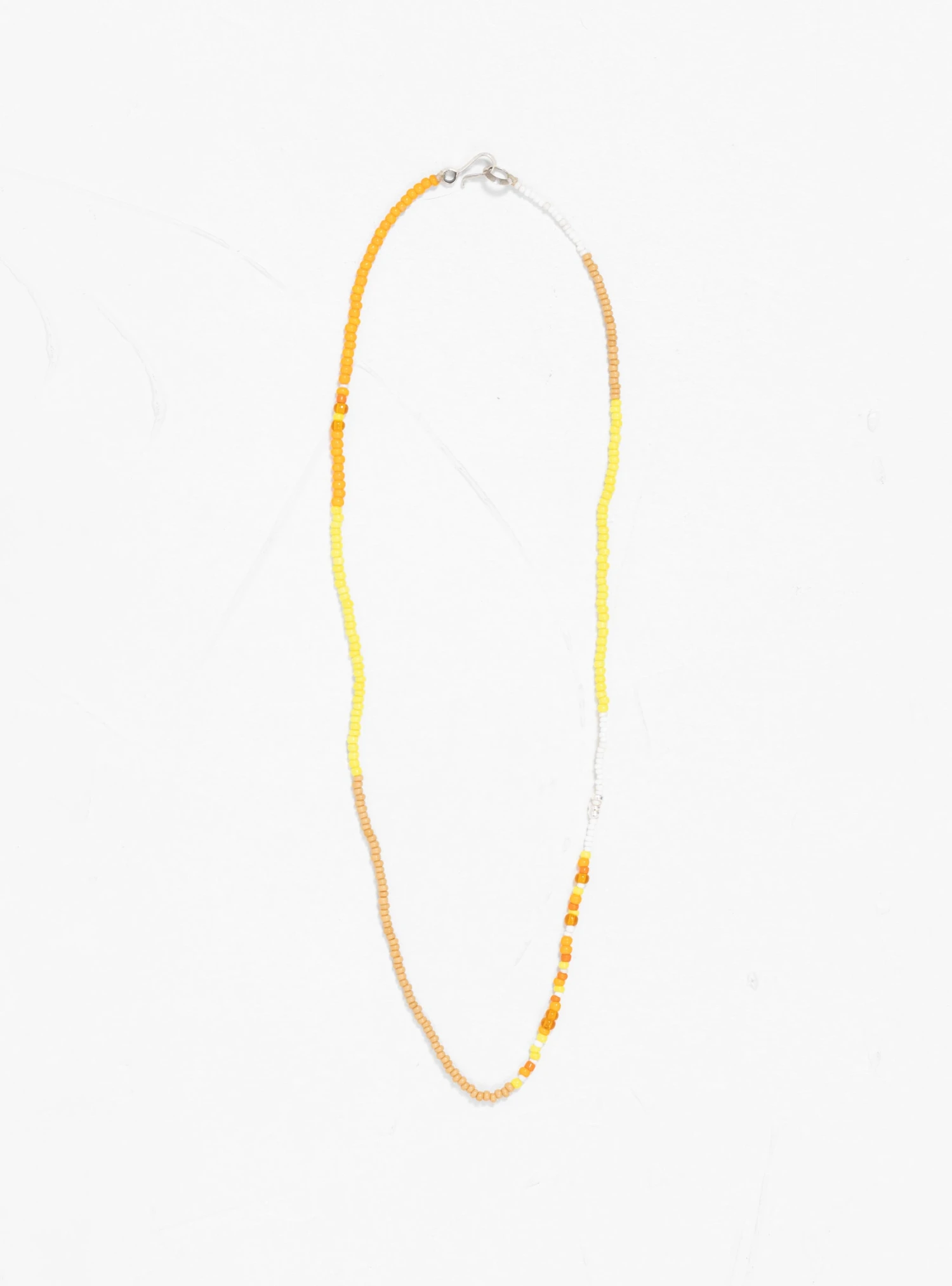 Handmade in Japan, this orange & yellow necklace from NORTH WORKS is threaded with vintage Venetian glass beads and fastens via a hook fashioned from a vintage American coin – famed for its high silver content.